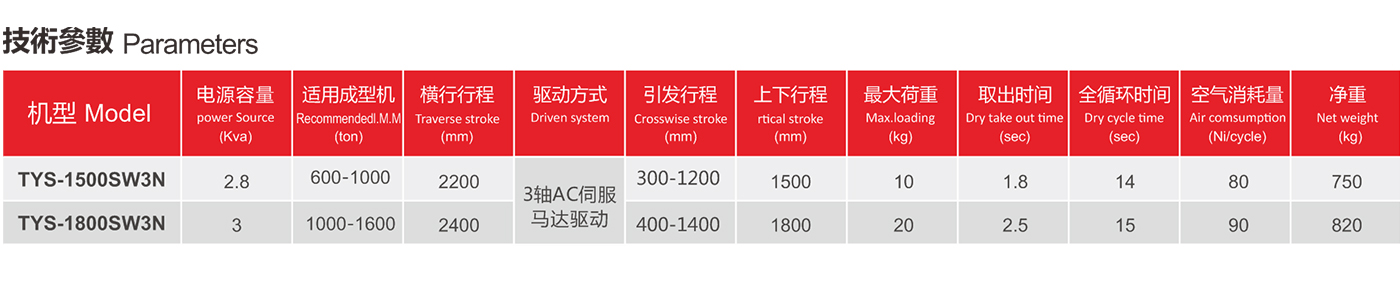 TYS中型橫走式系列為開放式(牛頭式)機械手,標配為雙截開放式,三軸伺服驅動。伺服驅動優點調試方便,運行速度快,動作平穩,使用壽命長。雙截式優點;減低機械手的整機高度,動作穩定性好,手臂上下速度快。引拔開放式;主要適用拿取長條型、面積大的塑膠產品(如汽車保險杠,地臺板等)
